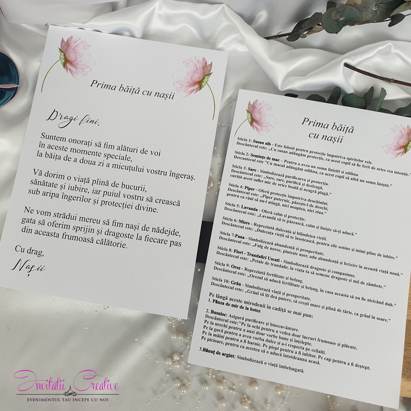 Set roz cu mirodenii baita cu nasii catifea si perle este destinat utilizării în cadrul ritualului tradițional pentru baita de mir, desfășurat a doua zi după botez. Acest ritual este un moment plin de simbolism și emoție, în care copilul este curățat și binecuvântat, de nasi pentru a începe viața cu noroc, binecuvantare si sanatate.