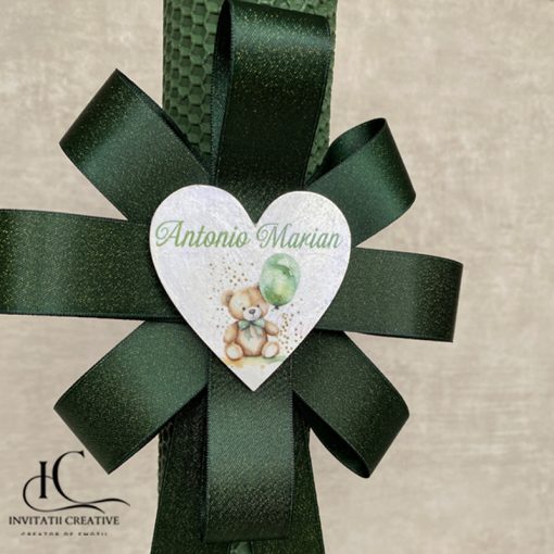 Lumanare botez baiat verde personalizata ursulet cu baloane