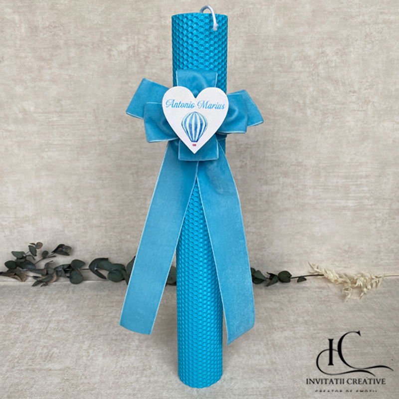 Lumanare Botez Ceara Albine Personalizata cu Balon Aer Cald, păstrând totodată o estetică minimalistă și proaspătă. Perfectă pentru cei care iubesc rafinamentul în simplitate. Această lumânare devine un simbol al luminii, al binecuvântării și al iubirii ce înconjoară fiecare suflet mic la început de drum.