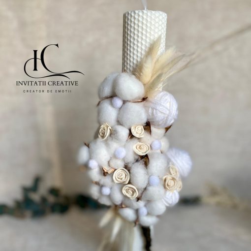 Creată manual cu grijă și inspirație, Lumanare Botez Delicate Dream cu Flori de Bumbac simbolizând începutul plin de speranță al unei vieți noi.