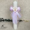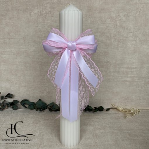 Creată manual cu grijă și inspirație, Lumanare Botez Fetita Eleganta cu Fundita Dantela Roz simbolizând începutul plin de speranță al unei vieți noi.