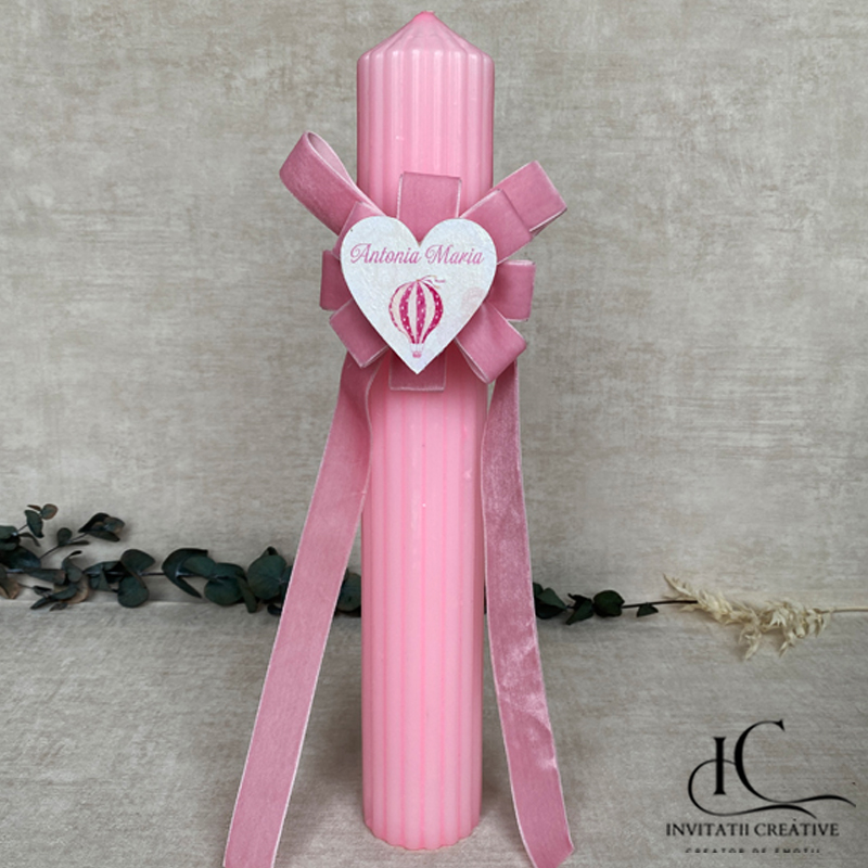 Creată manual cu grijă și inspirație, Lumanare Botez Floare Catifea Personalizata Balon cu Aer Cald simbolizând începutul plin de speranță al unei vieți noi.