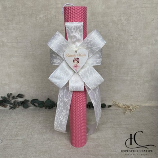 Creată manual cu grijă și inspirație, Lumanare Botez Floare Dantela Alba Inima cu Balerina Eleganta simbolizând începutul plin de speranță al unei vieți noi.