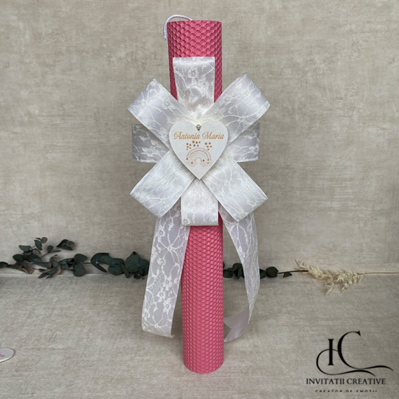 Creată manual cu grijă și inspirație, Lumanare Botez Floare Dantela Alba Inima Curcubeu Pastel simbolizând începutul plin de speranță al unei vieți noi.