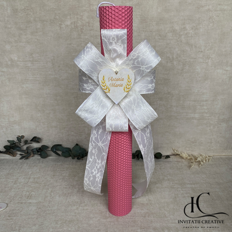 Design personalizat – fiecare lumânare este lucrată manual, cu atenție la detalii, pentru a reflecta stilul și tematica evenimentului tău. Inimioara vopsita este personalizata cu numele dorit si imagine prin tehnica transferului de imagine.