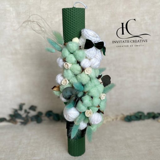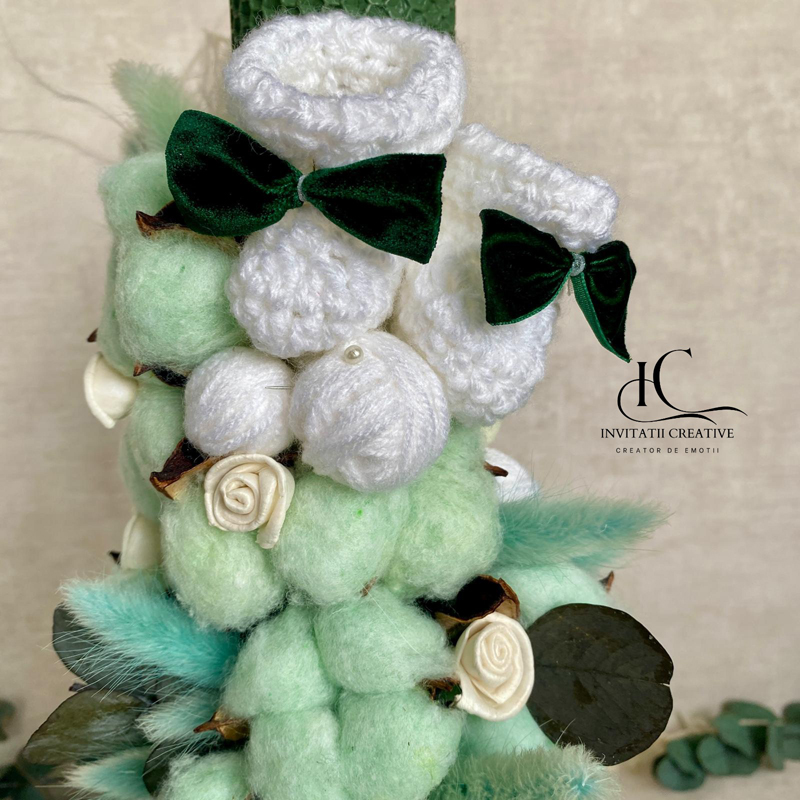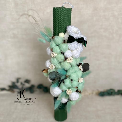 Creată manual cu grijă și inspirație, Lumanare Botez Green Delicate Dream cu Flori de Bumbac si Botosei simbolizând începutul plin de speranță al unei vieți noi.