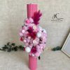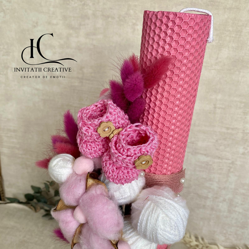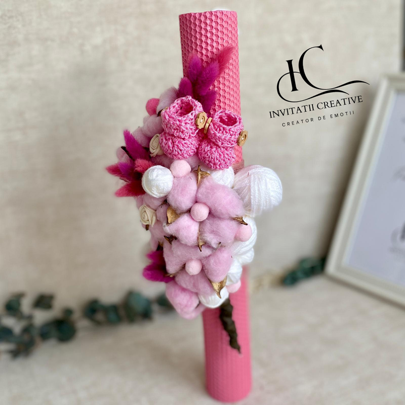 Creată manual cu grijă și inspirație, Lumanare Botez Pink Delicate Dream cu Flori de Bumbac si Botosei simbolizând începutul plin de speranță al unei vieți noi.