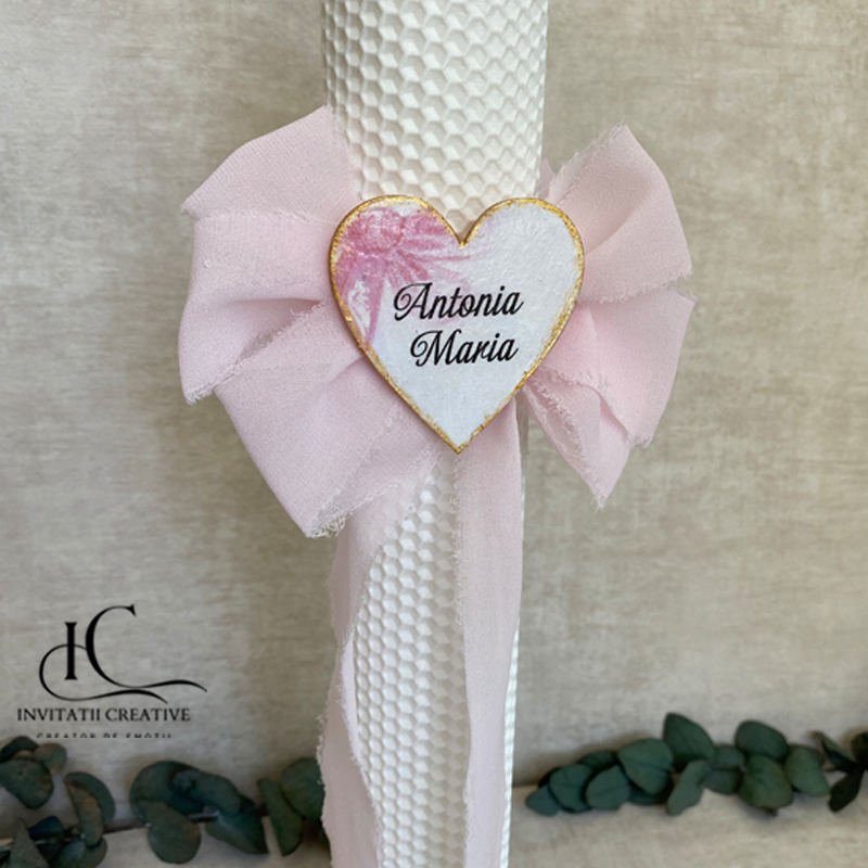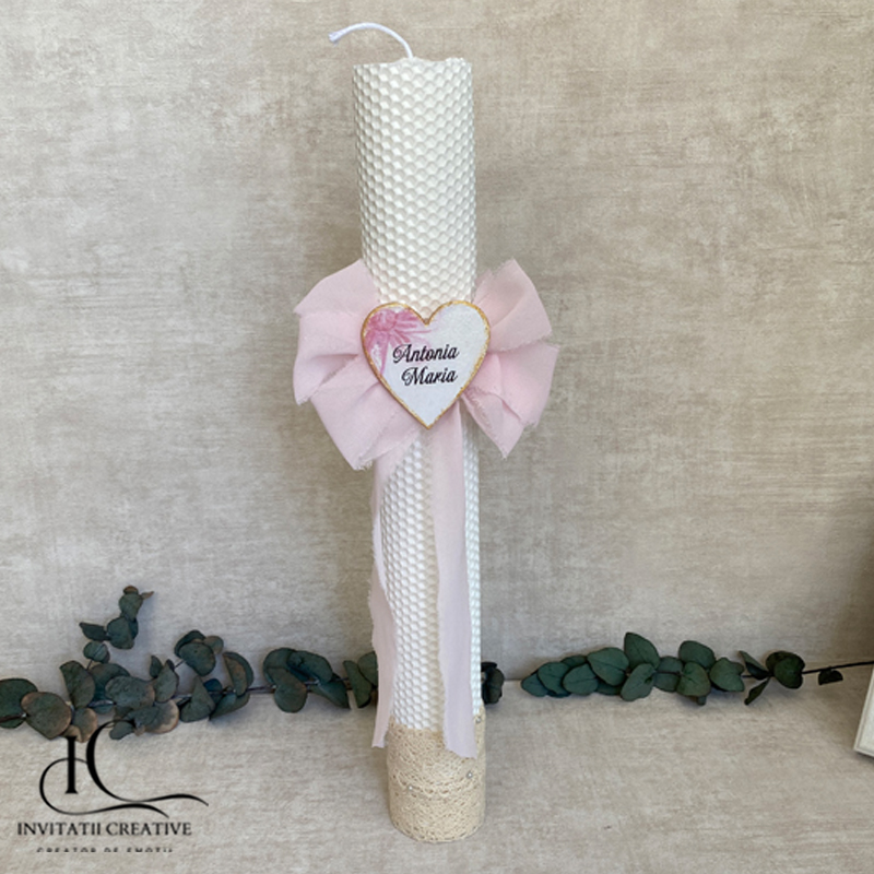 Lumanarea este personalizata cu o inimioara cu numele fetitei.