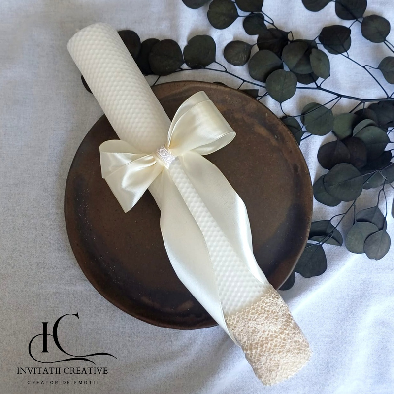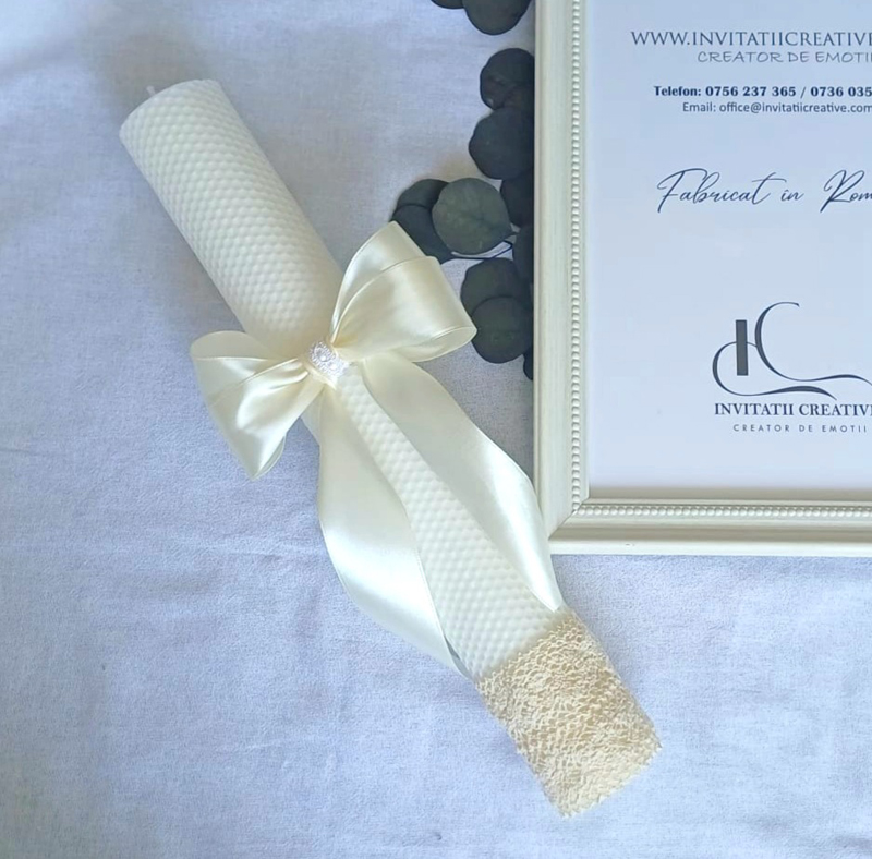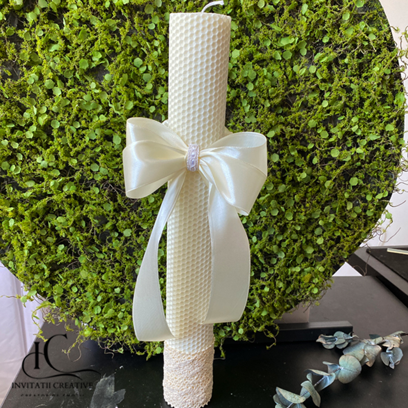 Lumânare de botez din ceară naturală de albine – un accesoriu elegant, artizanal, perfect pentru ceremonia copilului tău.