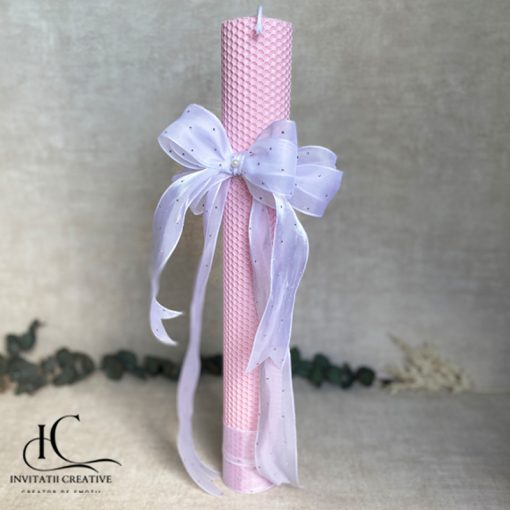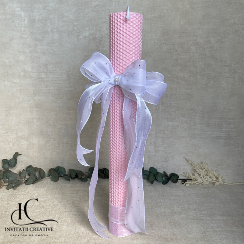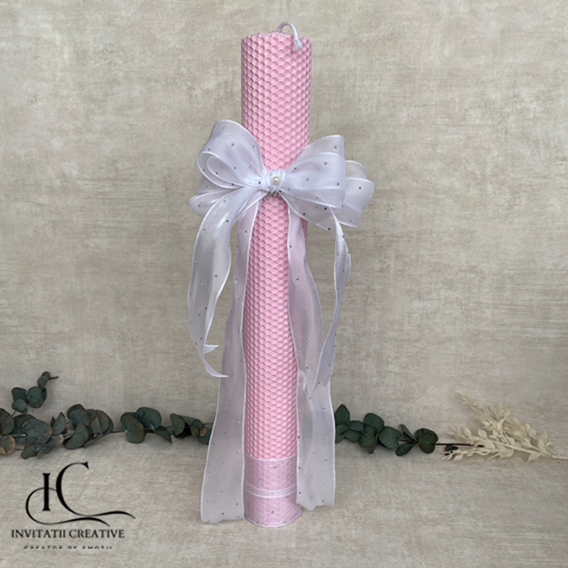 Creată manual cu grijă și inspirație, lumânarea Lumanare fagure de botez roz cu fundita speciala îmbină puritatea albului cu un accent natural de roz, simbolizând începutul plin de speranță al unei vieți noi.
